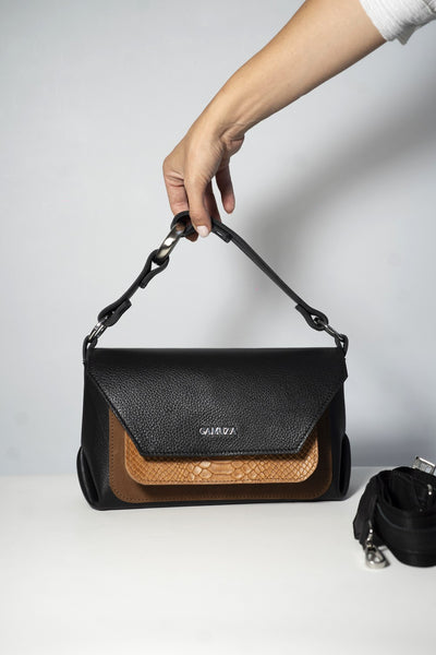 Pentru acele momente cand te privesti in oglinda inainte sa iesi din casa si iti spui: "Parca lipseste ceva". Geanta din piele naturala cu piele imprimeu sarpe. Marime mica. Pe exterior fata este prevazuta cu un buzunar mare. Bareta lunga este...