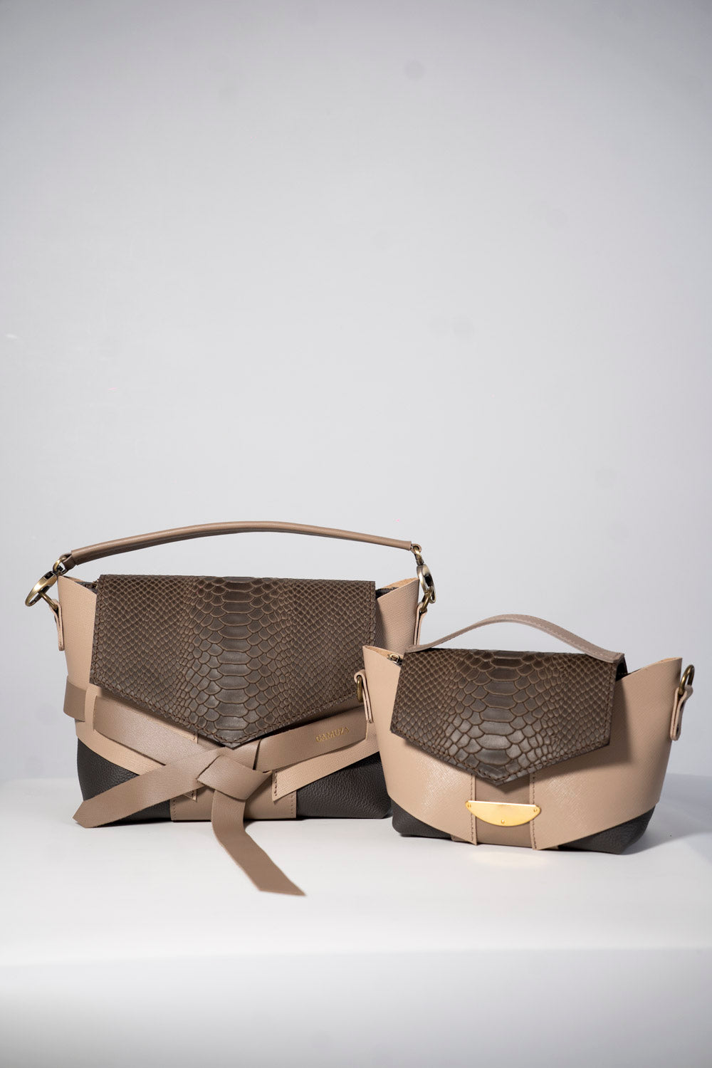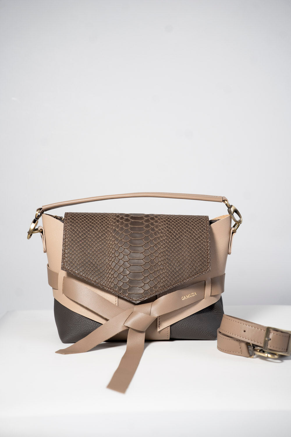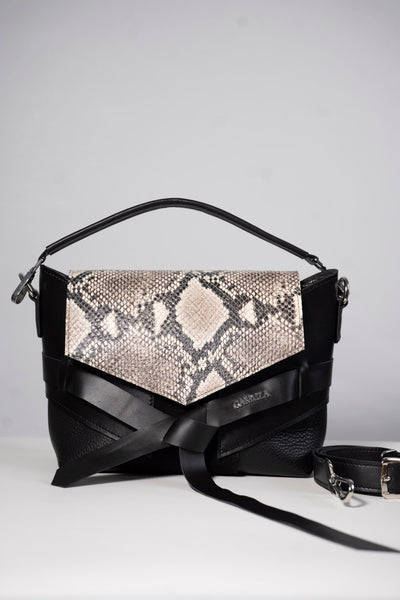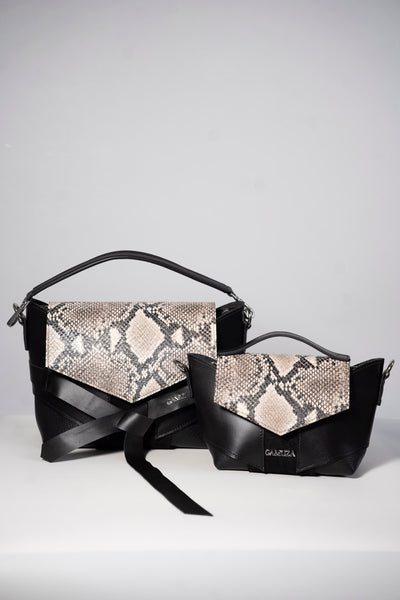 Pentru acele momente cand te privesti in oglinda inainte sa iesi din casa si iti spui: "Parca lipseste ceva". Geanta din piele naturala cu piele imprimeu sarpe. Marime mica. Pe exterior fata este prevazuta cu un buzunar mare. Bareta lunga este...
