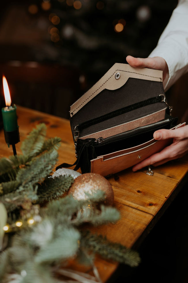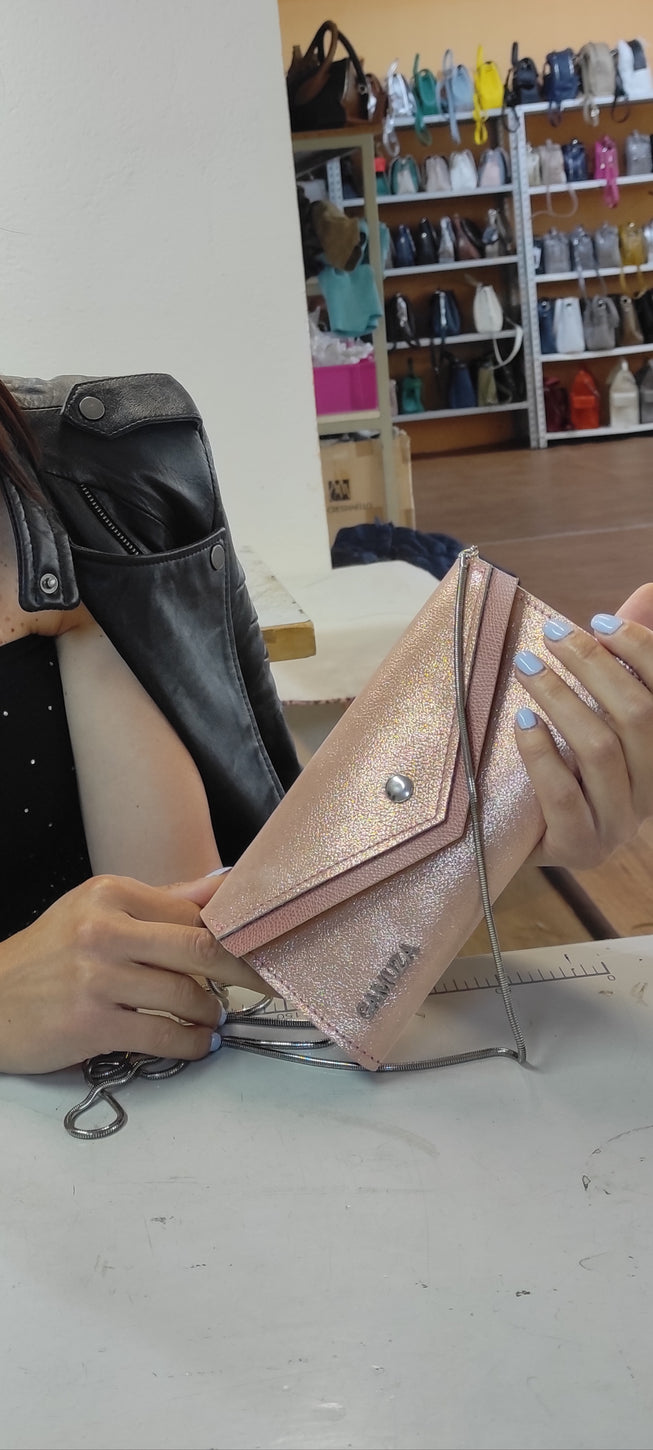 Discret si impresionant in acelasi timp, ca un cantec in surdina..... Portofel-plic din piele naturala safiano. Marime mica. Se poate purta si ca un portmoneu si ca un plic pentru diferite evenimente. Prevazut cu lant Lungime: 20 Inaltime: 10