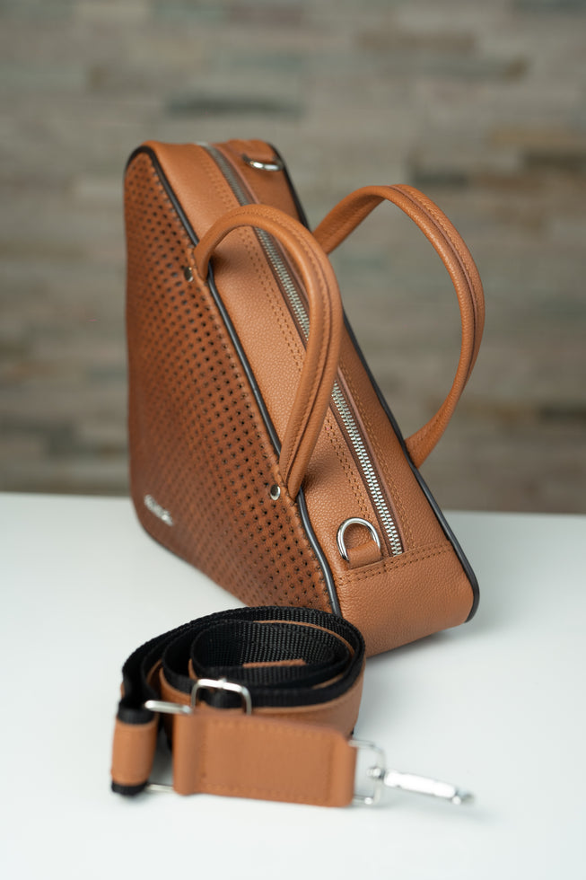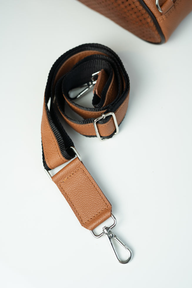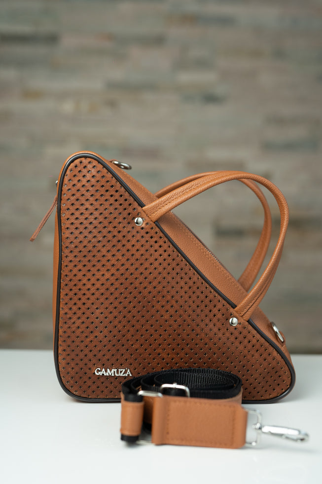 Geanta din piele naturala perforata cu piele naturala. Marime medie. Bareta lunga...