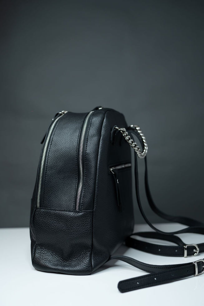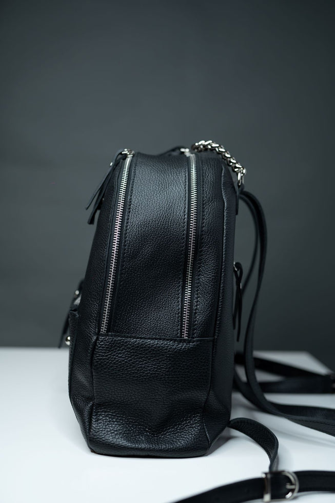 Yes! It`s back again! Black&metal is the new... black. Ghiozdan din piele naturala cu presaj. Marime mare Lungime: 28Latime: 6Inaltime: 26