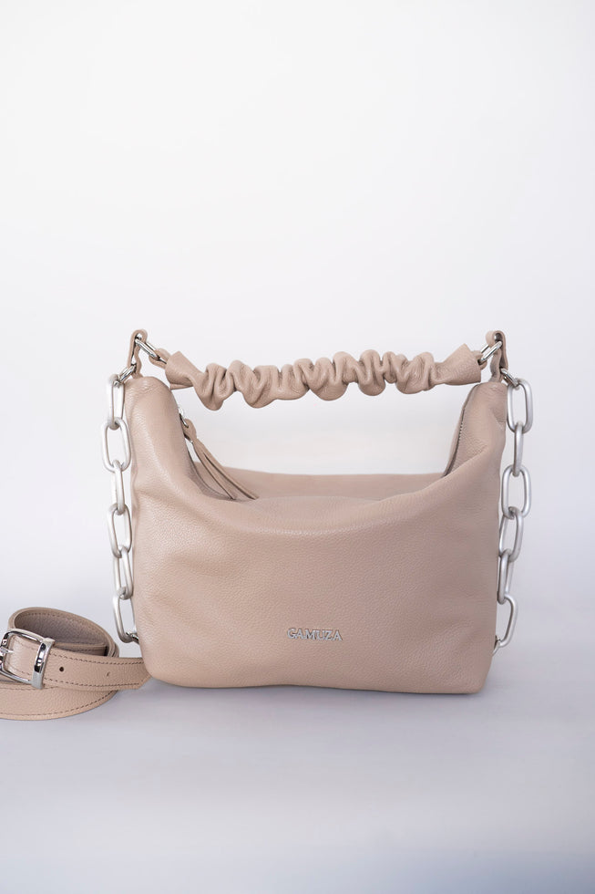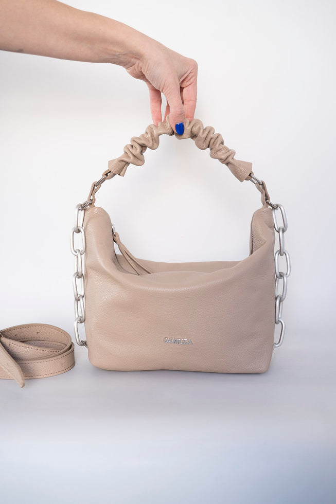 Pentru doua stari de spirit, amandoua pozitive. Geanta din piele naturala cervo cu textura moale. Manerul scurt este realizat manual din piele naturala box. Marime medie cu fermoar principal. Geanta este insotita de un saculet de protectie cu logo -ul...