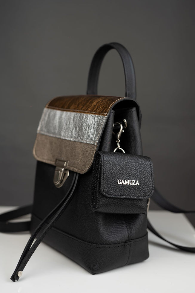 Yes! It`s back again! Black&metal is the new... capucino Ghiozdan din piele naturala cu presaj. Marime mare Lungime: 28Latime: 6Inaltime: 26