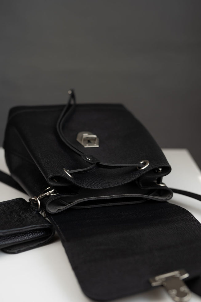 Yes! It`s back again! Black&metal is the new... black. Ghiozdan din piele naturala cu presaj. Marime mare Lungime: 28Latime: 6Inaltime: 26