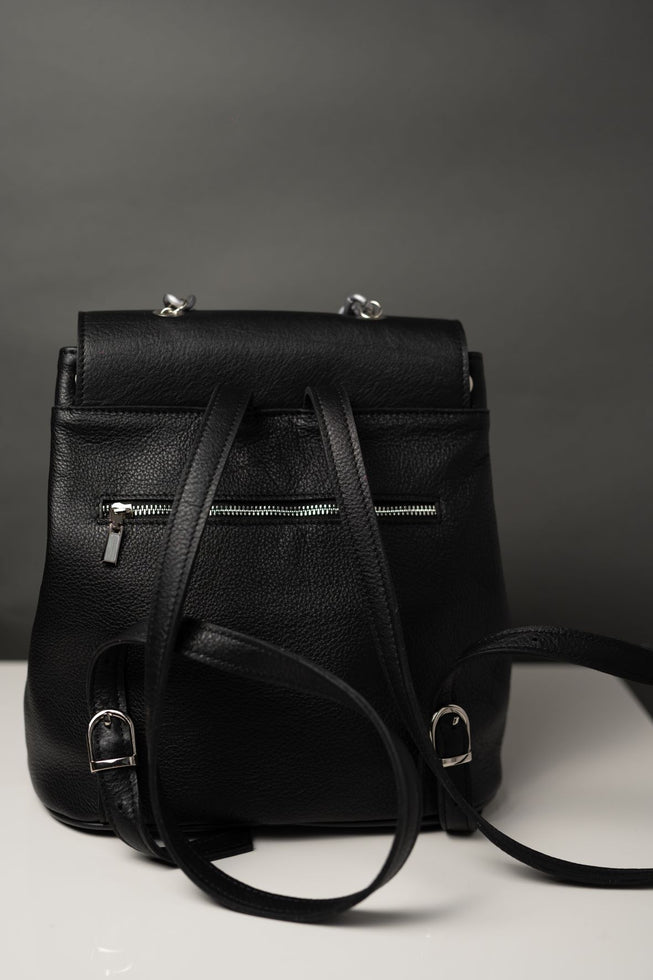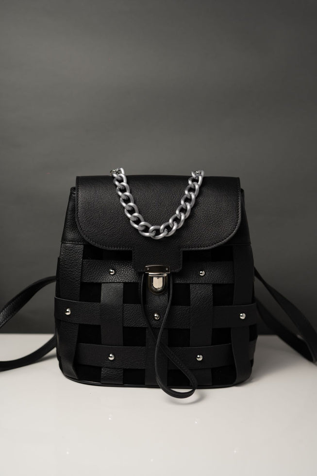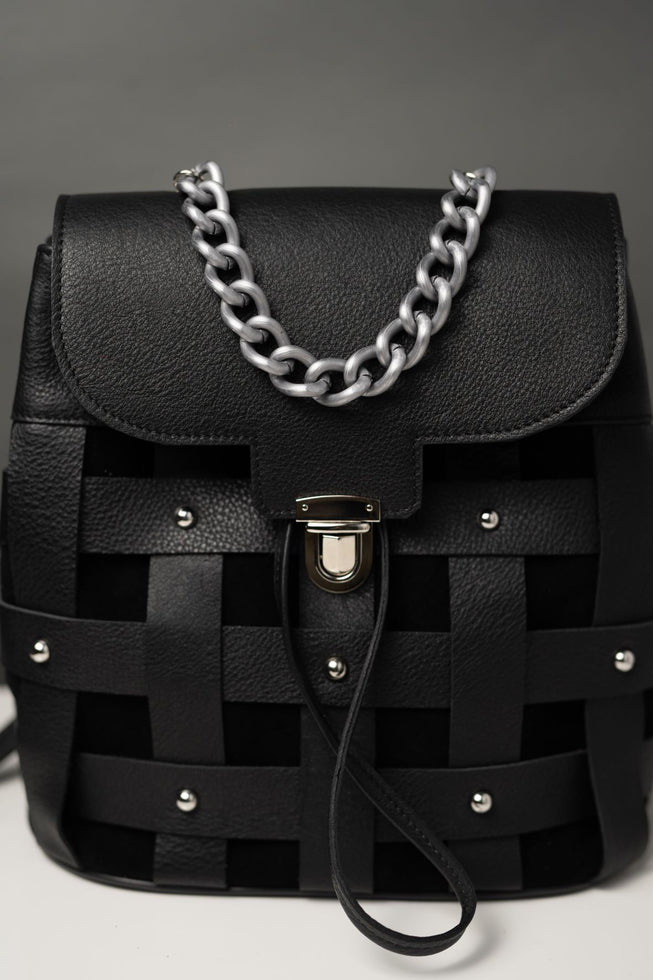 Yes! It`s back again! Black&metal is the new... black. Ghiozdan din piele naturala cu presaj. Marime mare Lungime: 28Latime: 6Inaltime: 26