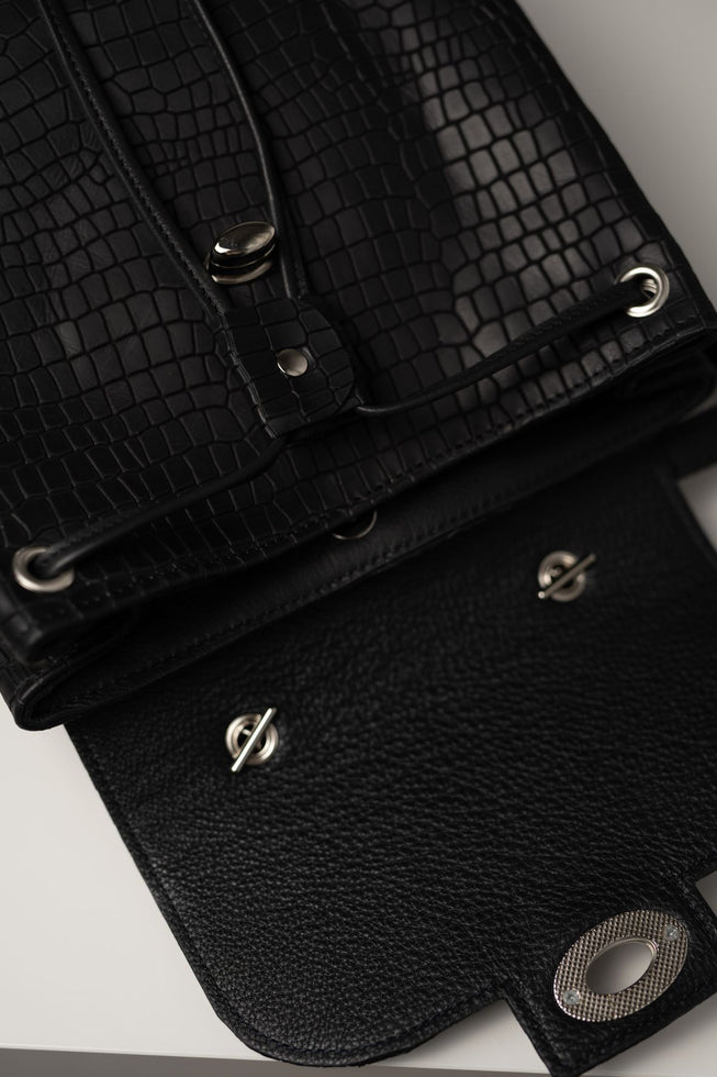Yes! It`s back again! Black&metal is the new... black. Ghiozdan din piele naturala cu presaj. Lungime: 28Latime: 6Inaltime: 26